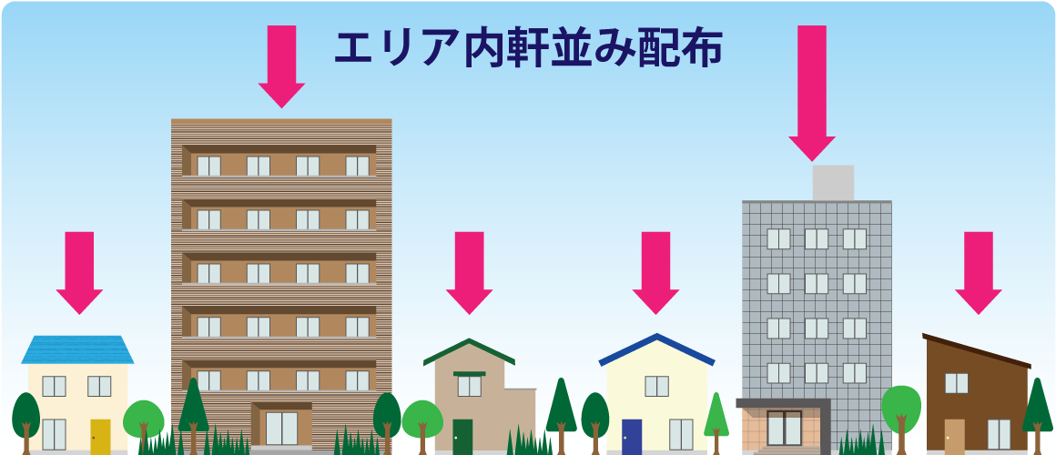 “ローラー配布””軒並み配布”とも云い、定されたエリアの中で「すべての住居を対象に」チラシを配布する方法です。※ポスティング業者での配布は全世帯数の6割~8割までの配布数になりますがポスティング・クラブは全世帯数の8割に配布が可能です!